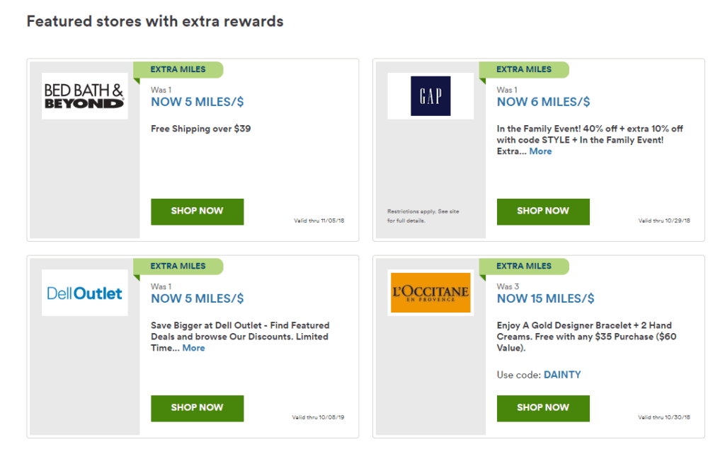 As always, double check the fine print on these offers, you’ll want to make sure you avoid purchasing gift cards and similar excluded items. (But sometimes it works anyway!) These usually aren’t cumulative, so you’ll only earn miles for the highest tier you complete. Most of the portals are also offering some kind of “Holiday Bonus” miles, which give a bonus multiplier on certain stores. For example, on the Alaska store, pictured above, you can earn bonus holiday miles on Gap, Macy’s, Bed Bath & Beyond, and others.