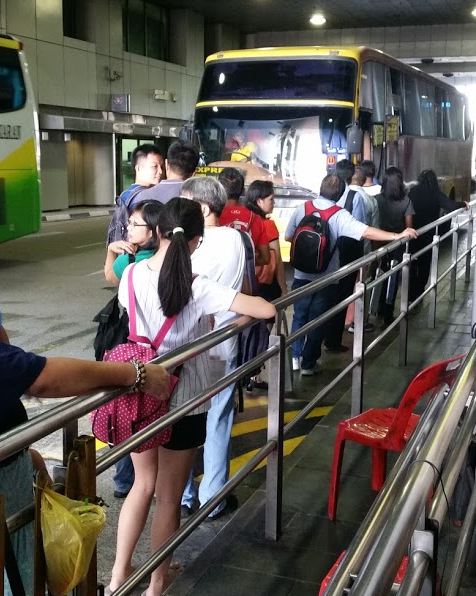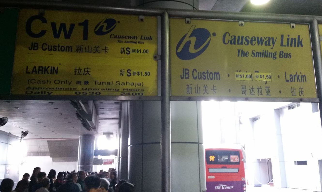 Once you get to the Woodlands border crossing station, the bus stops and you must get off with all your luggage. This is important as you will NOT be getting back on this bus. Go through Singapore exit immigration, and once you do, you’ll go down an escalator and queue back up for your bus. There are several different lines for the different bus companies – if you take the Causeway Link bus like we did, you’re looking for one that looks like this