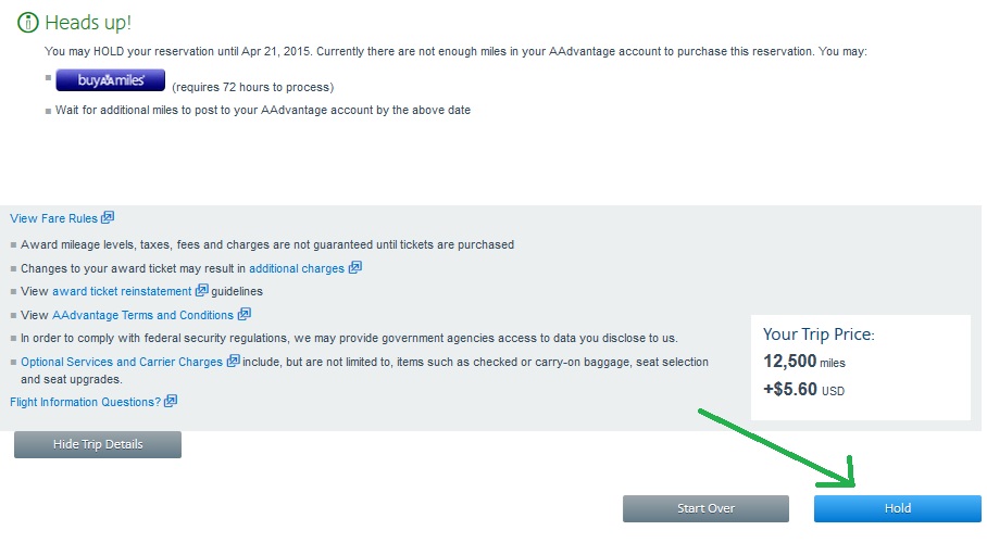 You do NOT have to have enough AAdvantage miles in your account to put do an American Airlines hold on your reservation. You can put an award on hold online (if the award is able to be booked online) – you just go through the whole procedure like you’re going to pay and then on the final screen, you’ll see something like this: