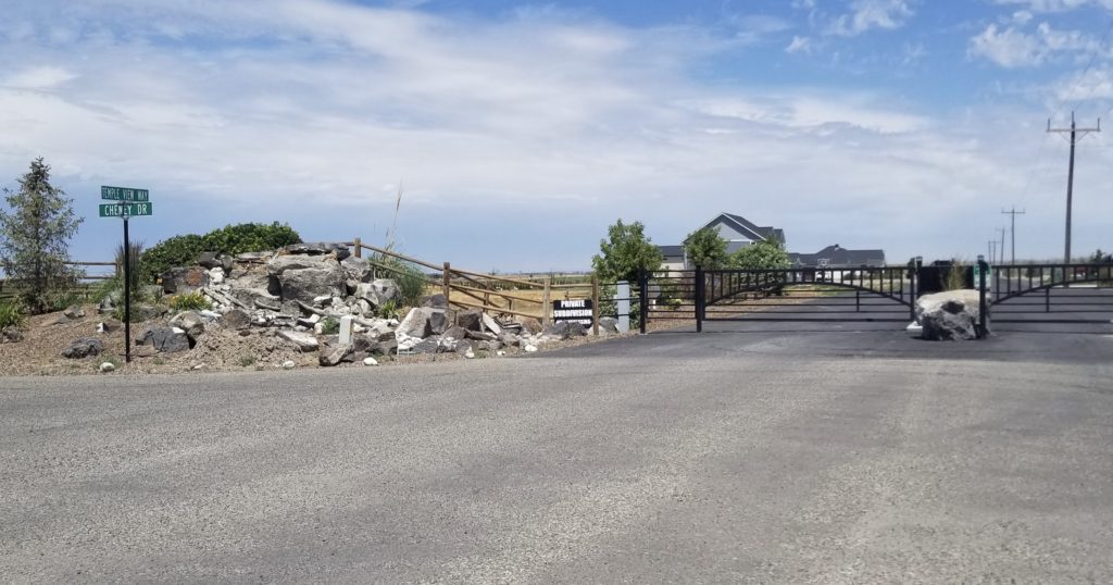 The Evel Knievel Snake River Canyon jump site is near Twin Falls, Idaho. Twin Falls is a bit south of Interstate 84 in south-central Idaho. It’s fairly easy to get to the Evel Knievel Snake River Canyon jump site. From Interstate I-84, you can either take Exit 173 (US 93, if coming from the west) or exit 182 (Idaho Route 50, if coming from the east). You’ll make your way a bit south of Twin Falls to Falls Avenue. Go to 3200 East and take that north for about a mile. You’ll come to this gated community pictured below.
