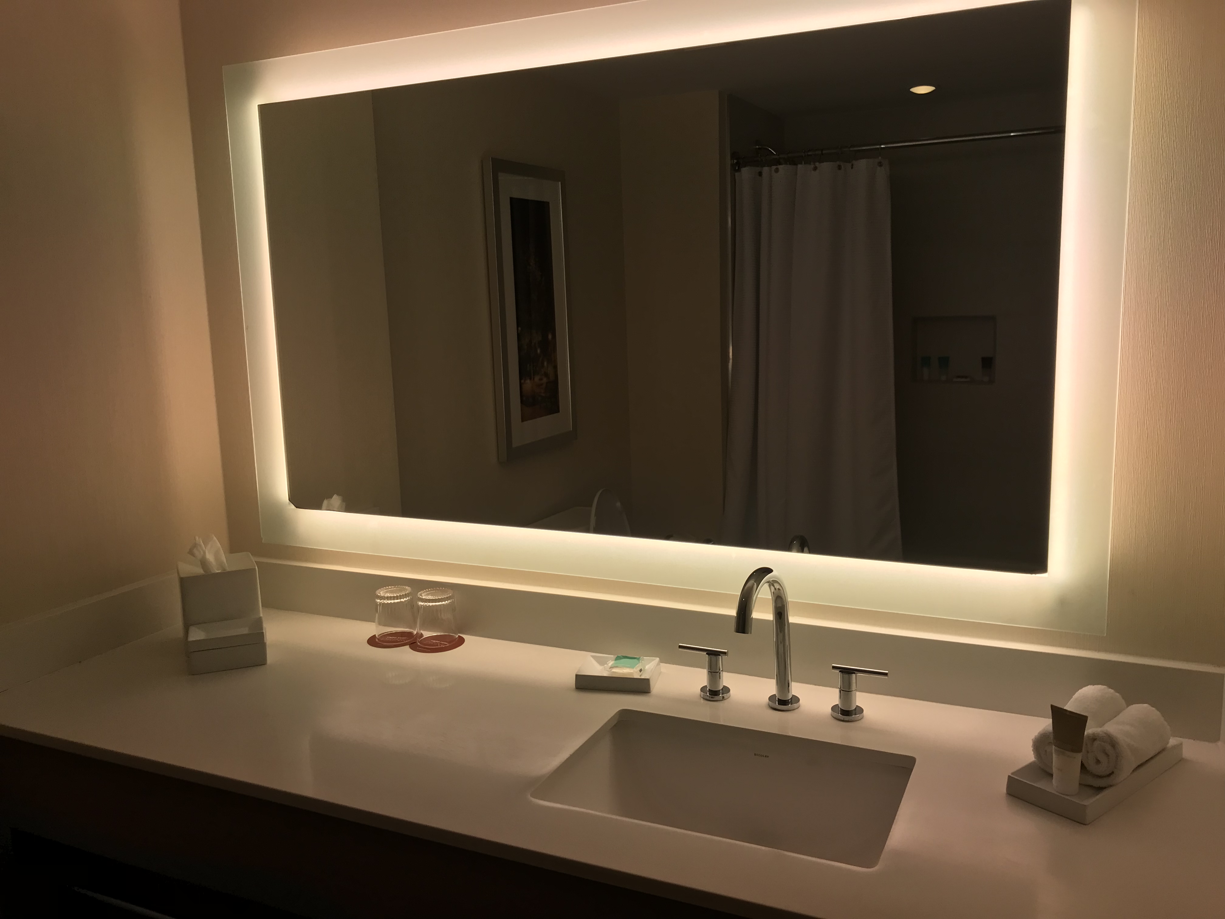 The sink featured a back-lit mirror, which I find to be more and more common at not just upscale hotels, but mid-scale brands like Hyatt House and Fairfield Inn & Suites. Honestly, the room is nice, but pretty much on par with the very new Fairfield Inn & Suites I stayed at for work in Virginia a few months ago. More often than not I find that “upscale” hotel amenities are just having to pay for breakfast and pay for parking.