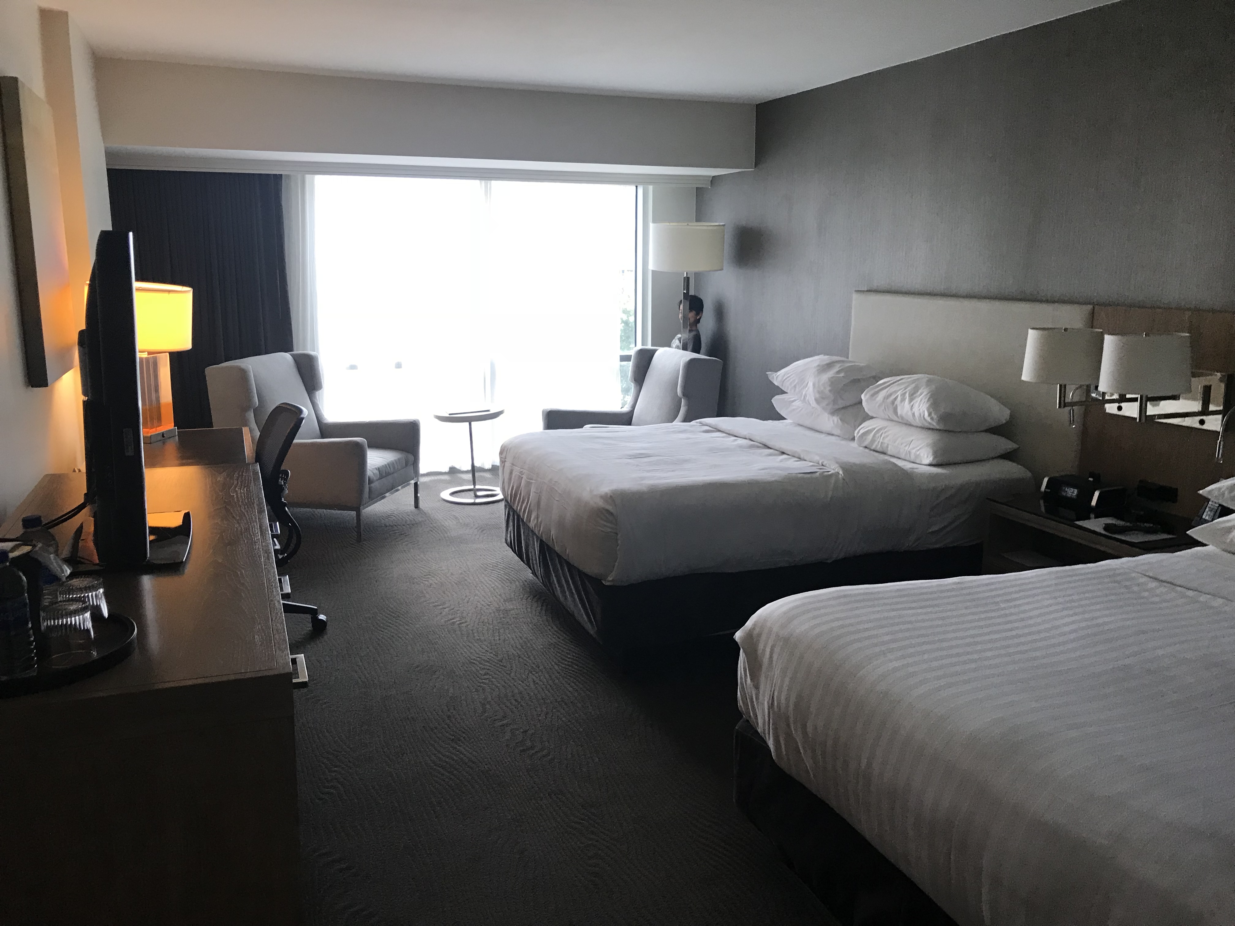 The lobby was deserted except the two agents at the front desk when we arrived. Although it isn’t a large property (11 floors, but not many rooms per floor), I was a bit surprised. Even when we came downstairs later and then arrived back from the park, I felt like we only ever saw 3-4 other guests. Check-in was obviously quick. I’d booked a standard double-double room, and that is what we were given. Discoverist status doesn’t get you much more than a bottle of water.