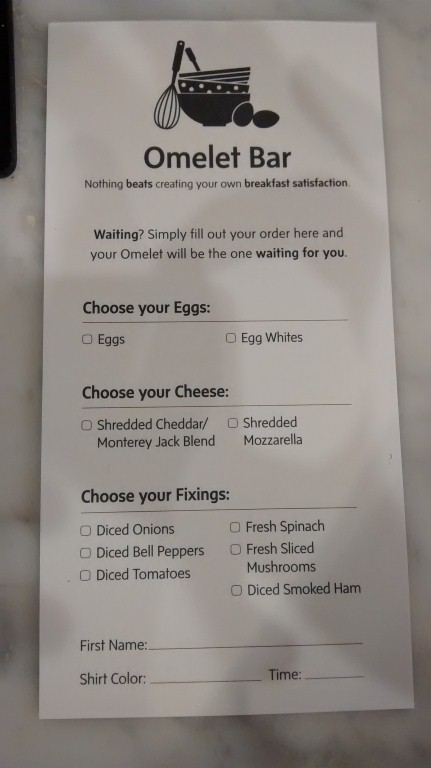 Breakfast was good – everything you hoped for. As you can see from the pictures, that included an omelet bar which is always a fun time. Of course, that led to the following dilemma