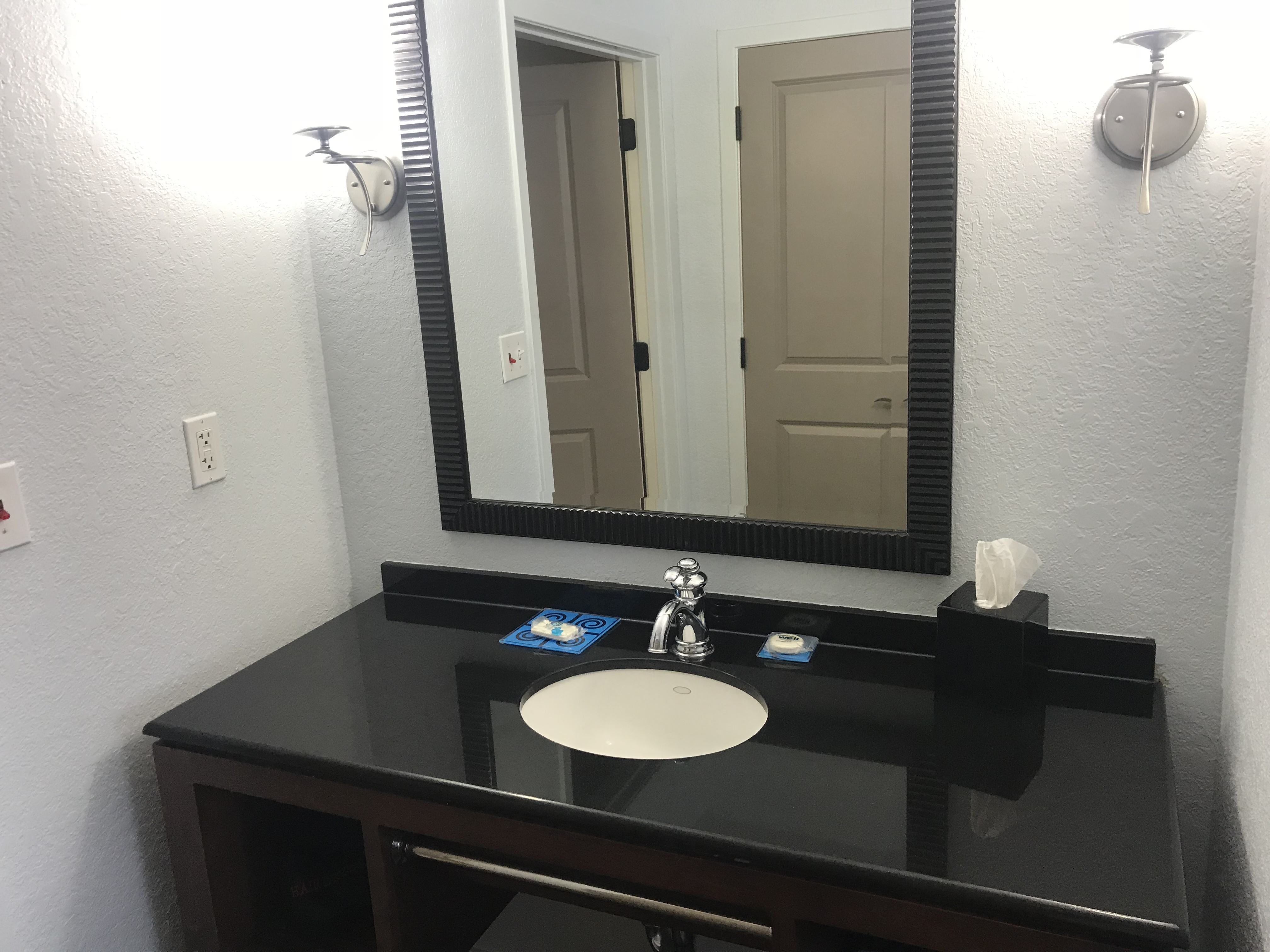 The bathroom is nice enough. The sink is located outside the actual bath, and it was the one part of the room I had issues with. It didn’t drain well. I shaved in the morning, and left a bunch of hair for housekeeping. I mentioned the issue to the front desk on departure, and he said he’d have maintenance take a look.