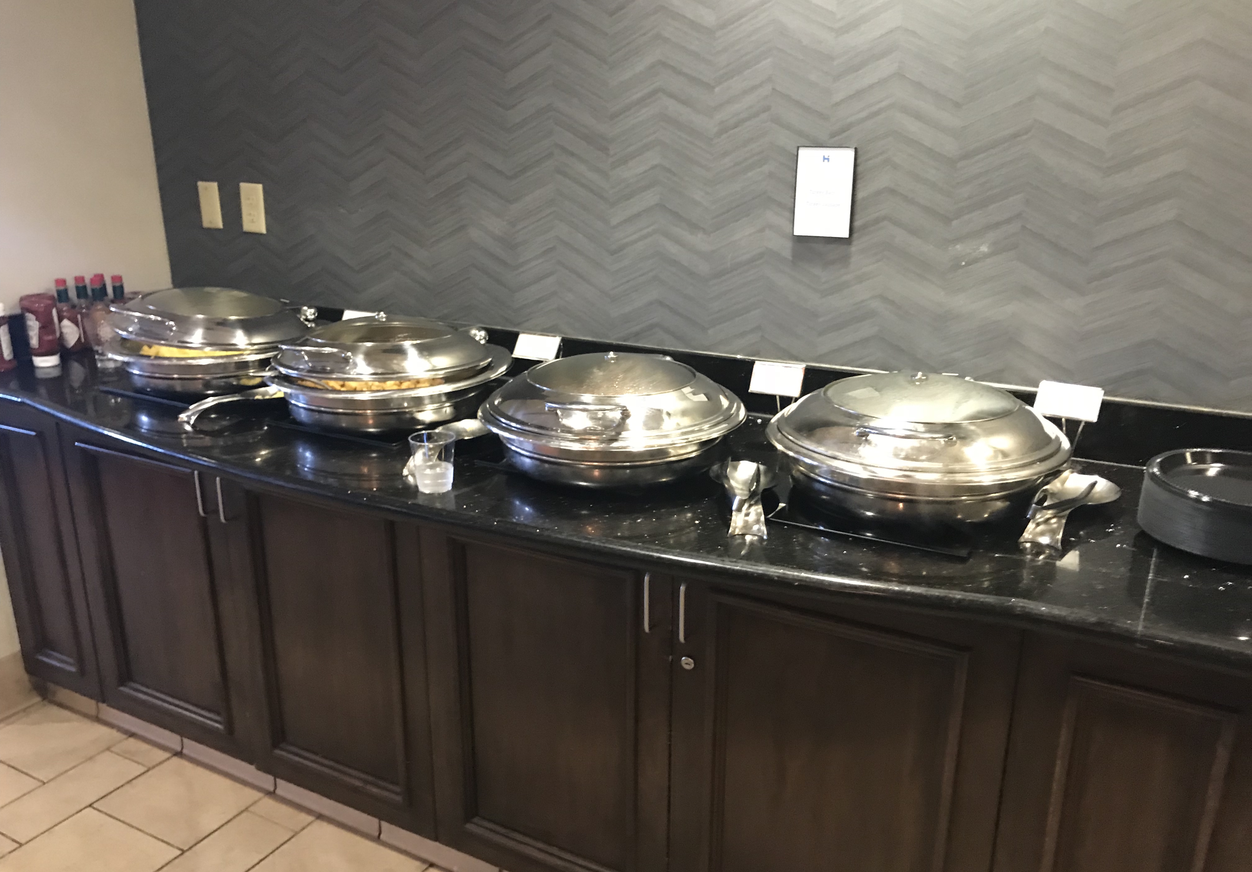 The first thing that caught my eye was the lack of the square white plates. I thought these were supposed to be the standard issue for Hyatt House breakfast. Instead, there were black plastic plates. Major downgrade, but at least we weren’t using styrofoam.