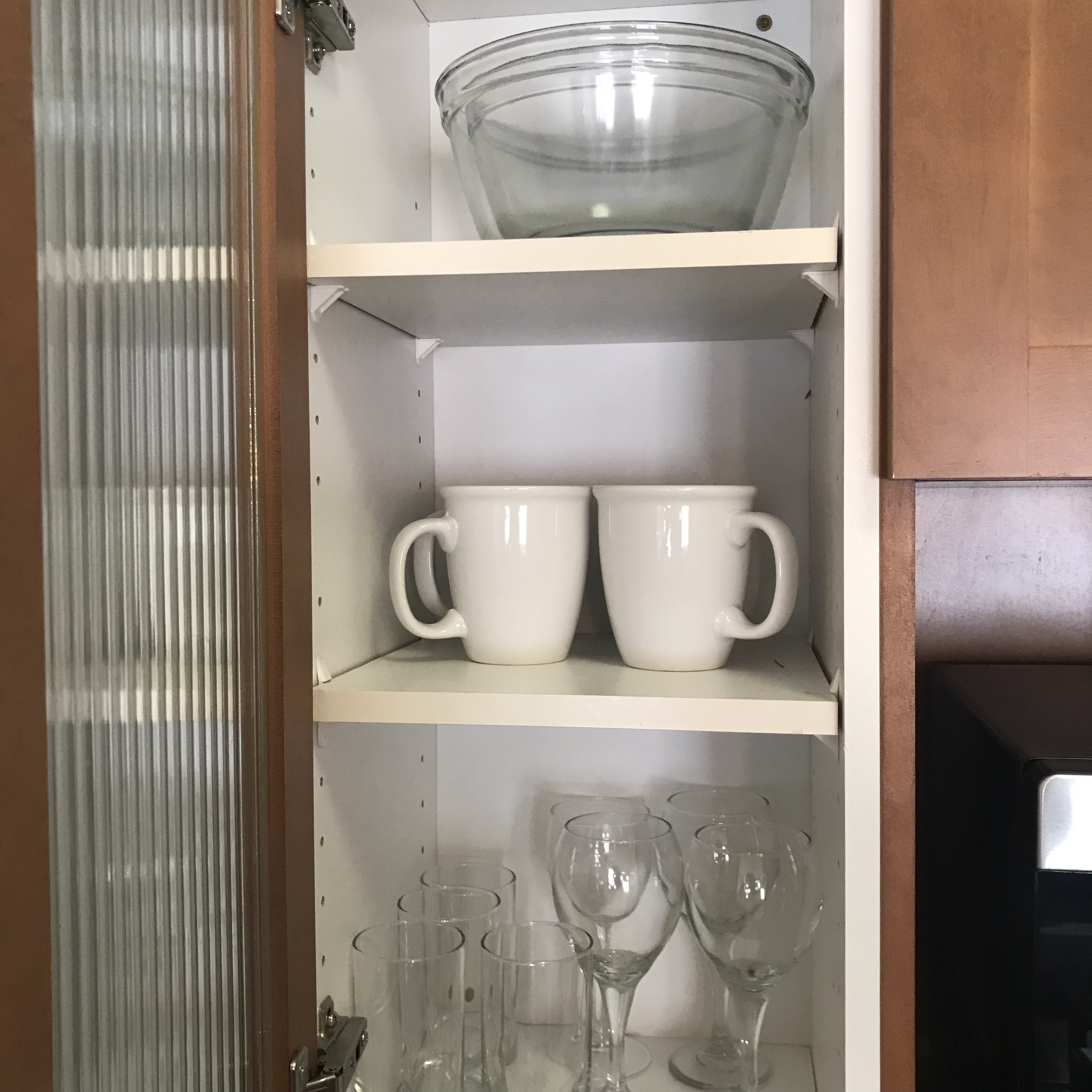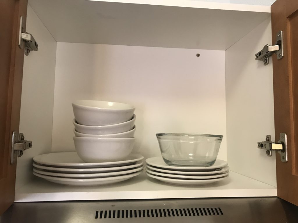 I checked out the cupboards to see how well stocked the kitchen is. There were mugs and glassware for four, plus glass cooking bowls.