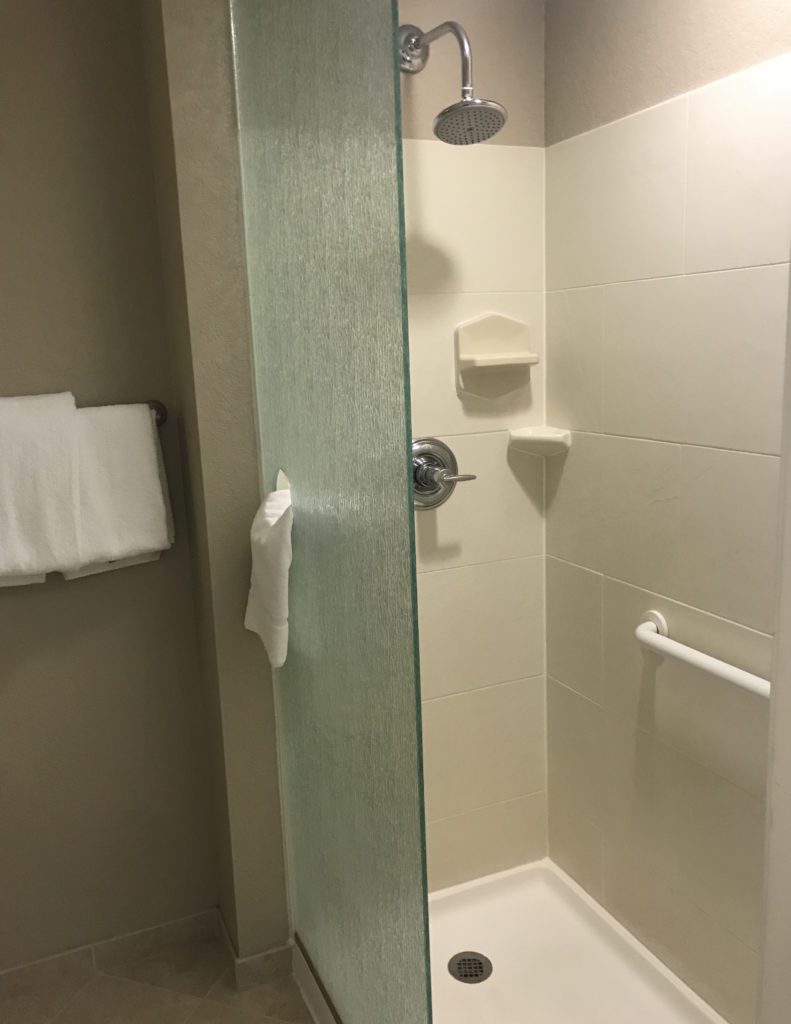 The shower was one of those “modern” half glass-style that I dislike. While I didn’t get water all over the floor quite as badly as the last time I stayed at a hotel with one of these, some still left the shower. I really don’t understand this design. It baffles me. Maybe it’s easier to keep clean? At least the shower was large, the pressure good, and the temperature great.