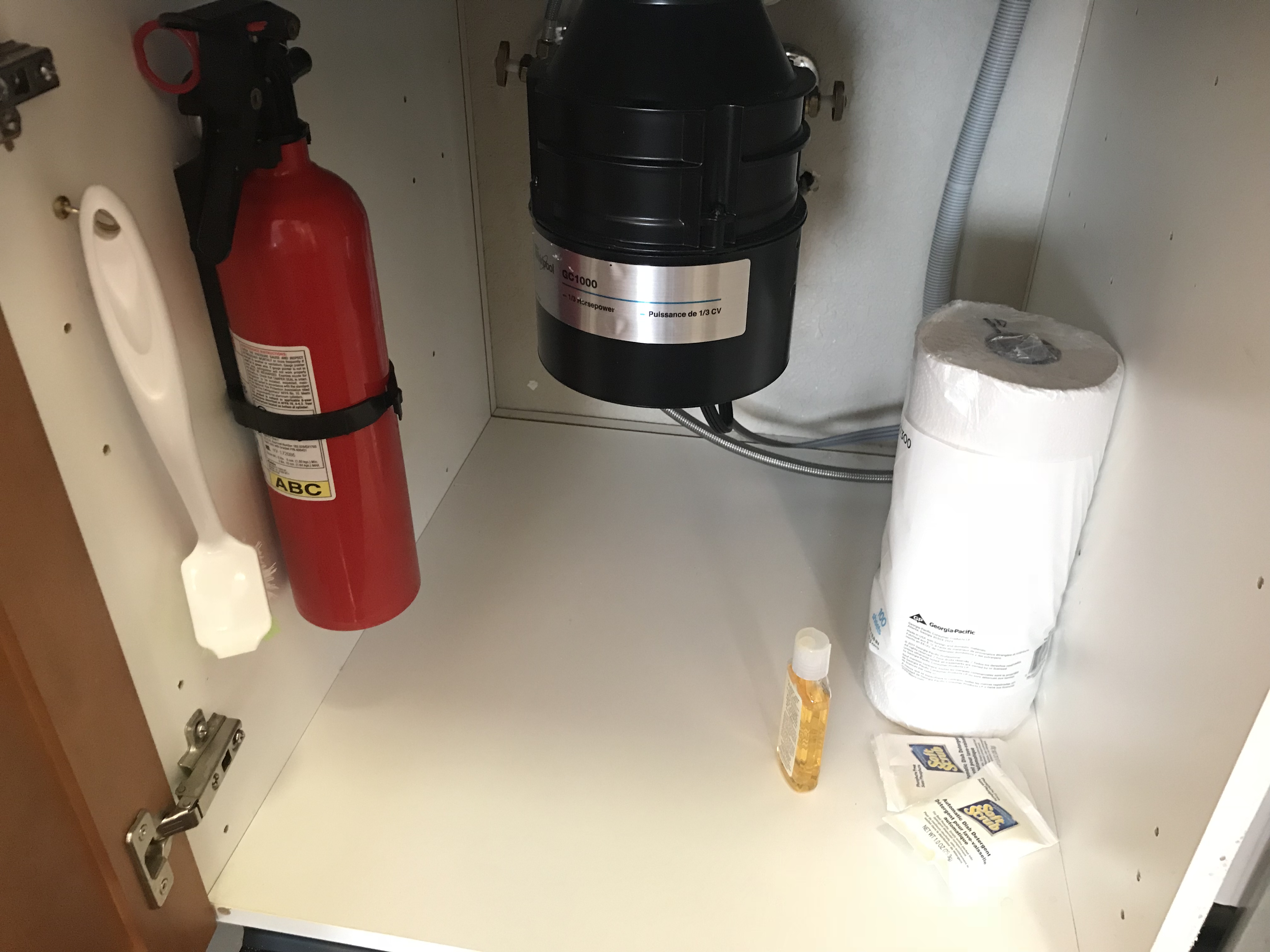 Underneath the sink are extra paper towels, as well as both dish soap and dishwashing pods.