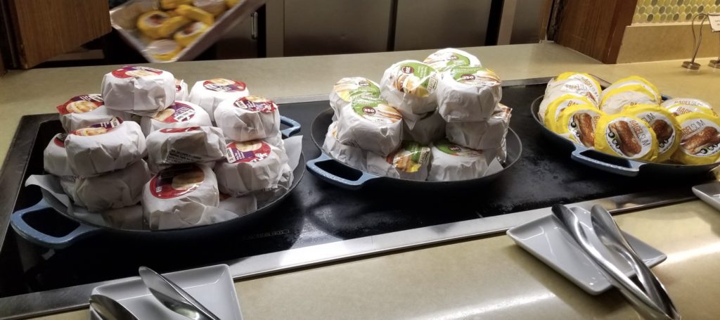 There were a variety of different items that rotated each day. One day there were eggs, Portuguese sausage and french toast.