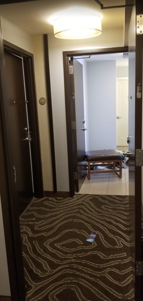 We were in rooms 531 and 532 and had 2 keys for each room. Either key worked this exterior door, and then each room could be independently closed and opened with the individual key. So we would normally shut and lock the main door and leave the 2 room doors open (cracked). But this is a nice way to do connecting or adjoining rooms because if you DON’T want adjoining rooms, you don’t have to deal with the added noise or security concerns of having an extra interior door in your room.