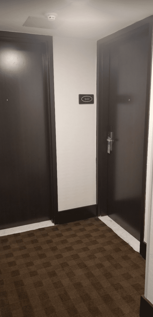 I was given Room 942, which was part of a corner suite. You could block off 2 rooms (942 and 944) or even 3 rooms (940, 942 and 944) with a separate door. I find this to be a nice compromise between getting adjoining rooms and people not wanting to have a door to another suite in their room.