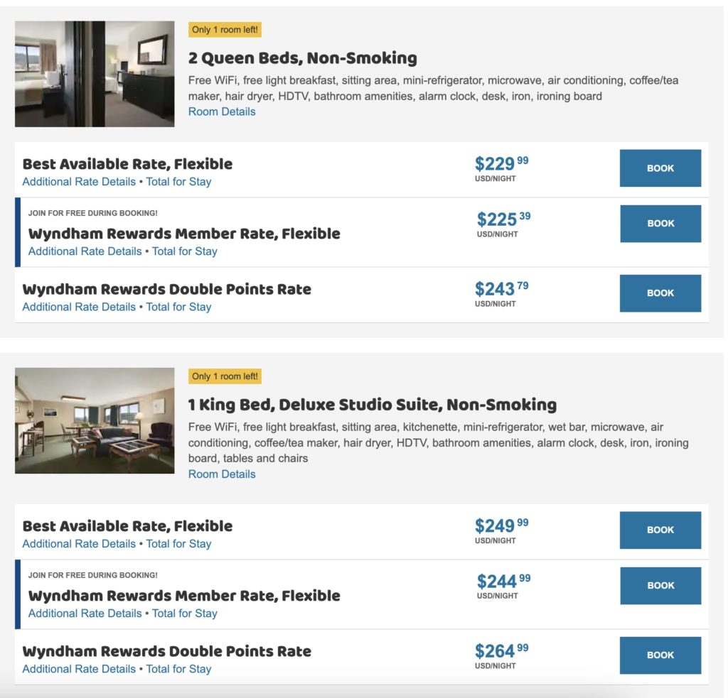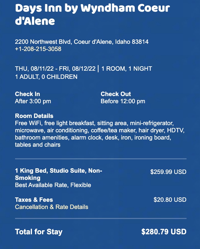 I usually try to read the recent reviews just to get a feel for what a stay here would be like. I had read good reviews about the Days Inn Coeur D’Alene so had no qualms about booking it. In fact, prices for the hotel (and most of the hotels in the area) were pushing $200 / night. I used 13,500 Wyndham Rewards points which I thought provided outstanding value. Maybe not the 3+ cents per point I got using Wyndham Rewards points for Vacasa vacation rentals, but still quite solid. It’s 13,500 points / night instead of 15,000 points / night thanks to my having the Wyndham Business credit card