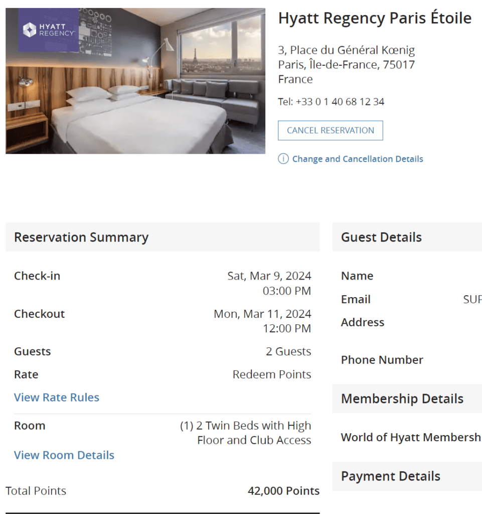 After a bit of trying to work things out with the staff at the hotel, I ended up just canceling the bookings at the Hyatt Regency Paris Etoile and trying to find a different room. We eventually settled on a cash booking at the Marriott Courtyard Paris Gare de Lyon. We used the $300 travel credit from our Capital One Venture X card as well as Venture miles to offset the booking, and had a great stay. Perhaps it will have to be next time to book this hotel.