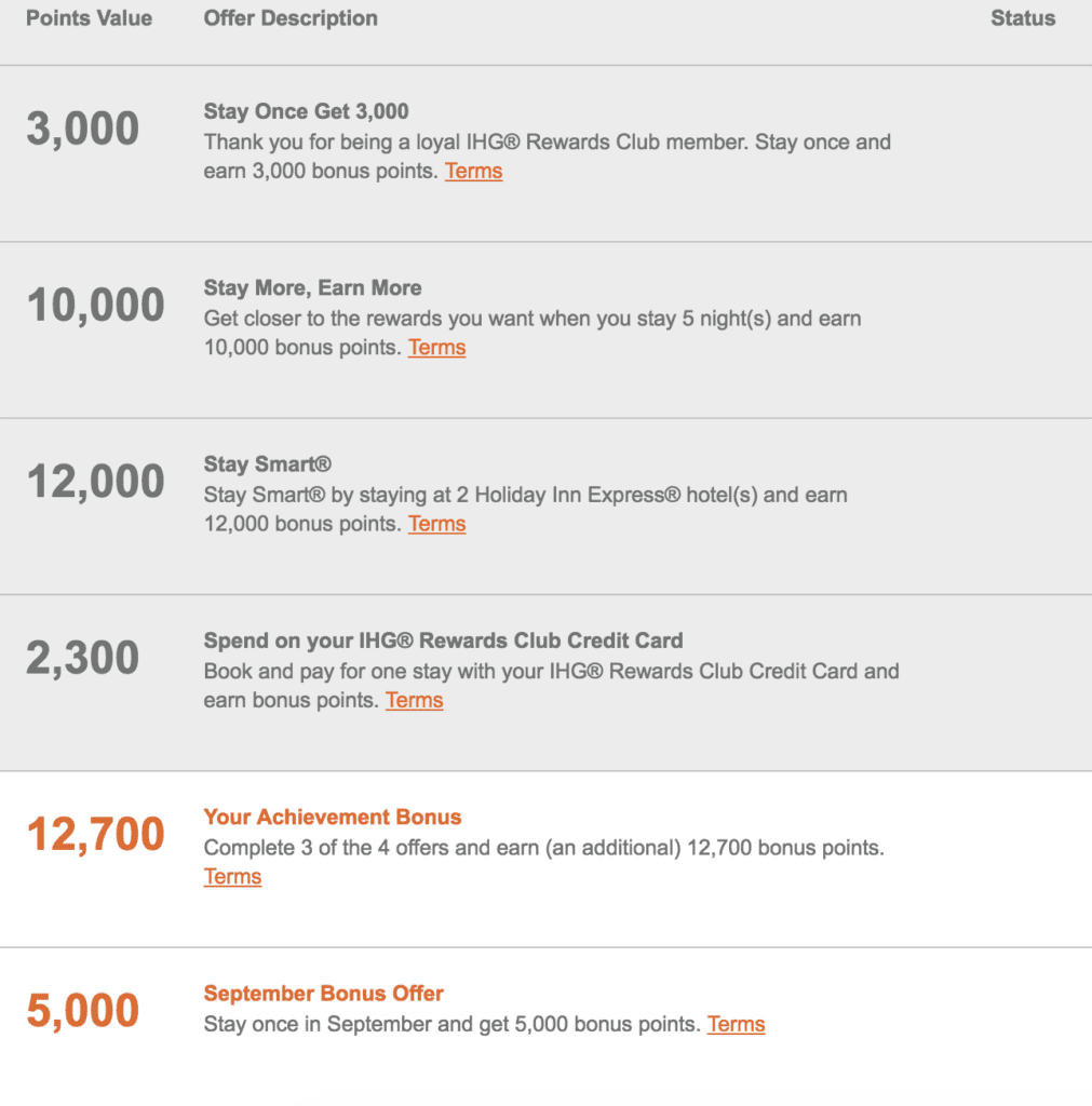 Different offers but same net – 2 stays at a Holiday Inn Express (one of my favorite budget hotels anyways!), including one in September, would net her 35,000 points