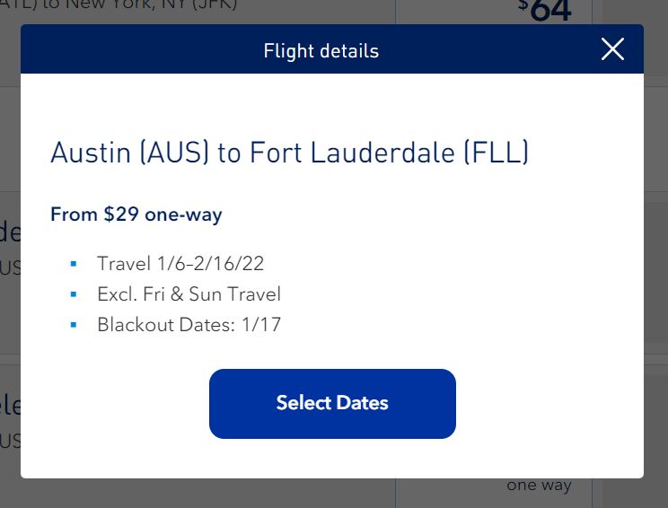 While the sale advertises JetBlue flights for as low as $49 for each one-way segment, I found some options for even less. The cheapest one-way flight I found was $29 one-way from Austin to Fort Lauderdale.
