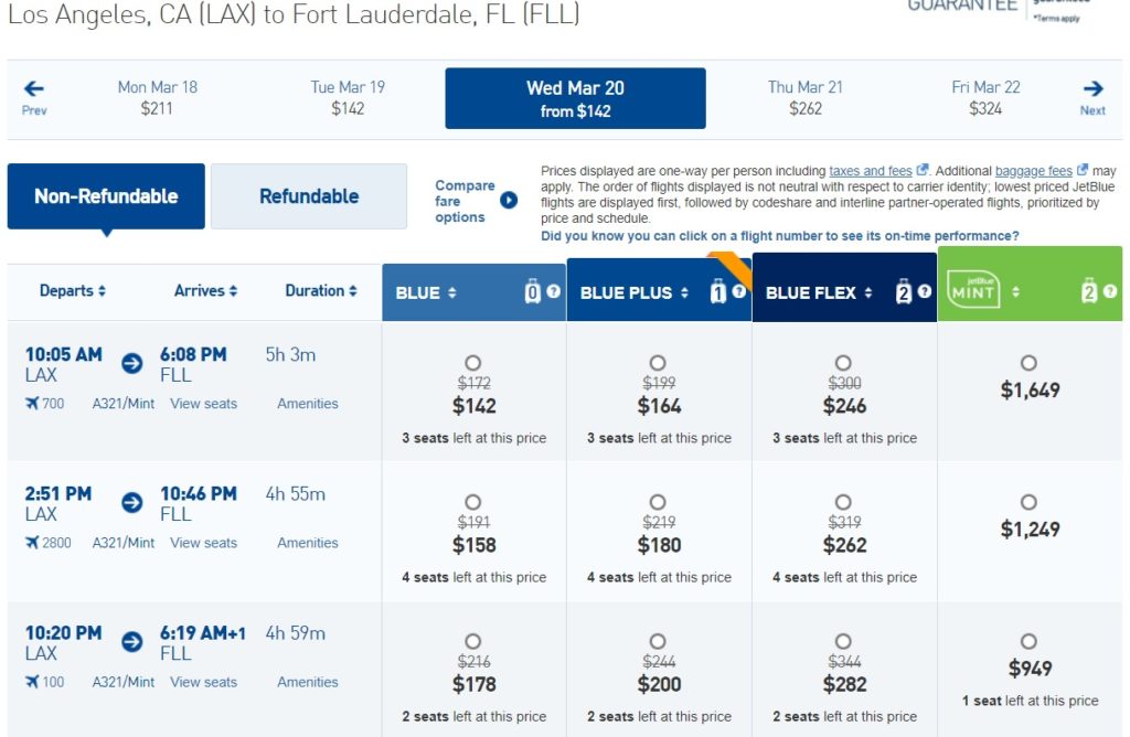 The deal is 20% off base fares, not including taxes and fees. Unfortunately, the discount isn’t valid for previously booked fares, unlike Southwest’s sales which allow credits for price differences on earlier bookings. Also, the discount is not valid in connection with JetBlue Vacations packages, Mint fares, award flights, taxes/fees, partner or code share or interline flights. This deal can can also only be booked directly through the promo page using the promo code GLITZ. See But act quickly: sale ends tonight at midnight.