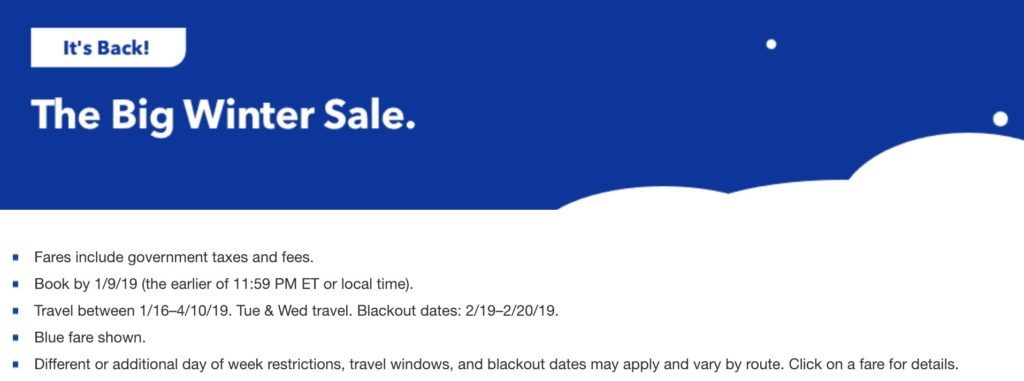 JetBlue’s great winter sale is live for 2 more days. The travel window is between 1/16 – 4/10, with blackout dates of 2/19-2/20. Scores of routes are priced below $100 each way, including dozens of options for warm weather or ski destinations. Options for bundling hotels with flights are included as well. But don’t wait too long: this sale ends at midnight Eastern Time, Wednesday evening.