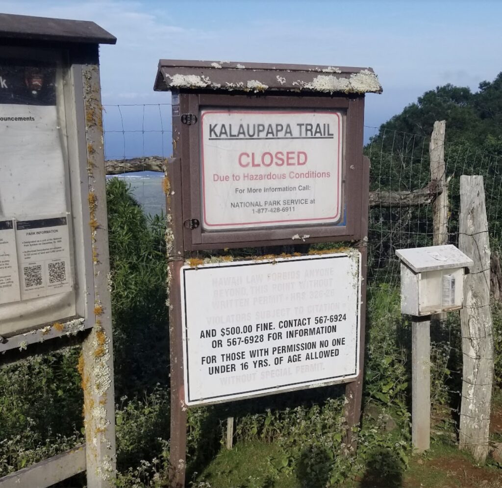 - When I arrived in Molokai, I booked a taxi to take me to the trailhead of the tail down to Kalaupapa. Although the trail is blocked, I was told that shortly after the fence at the road there was a sign indicating the county border. While I didn’t want to go down the trail all the way to Kalaupapa, I didn’t see a problem with going to the county border and taking a picture of the sign