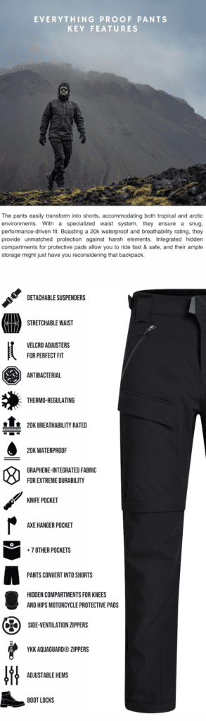 Here’s a video showing off some of the different options and features of the Everything Proof Pants and Shirt