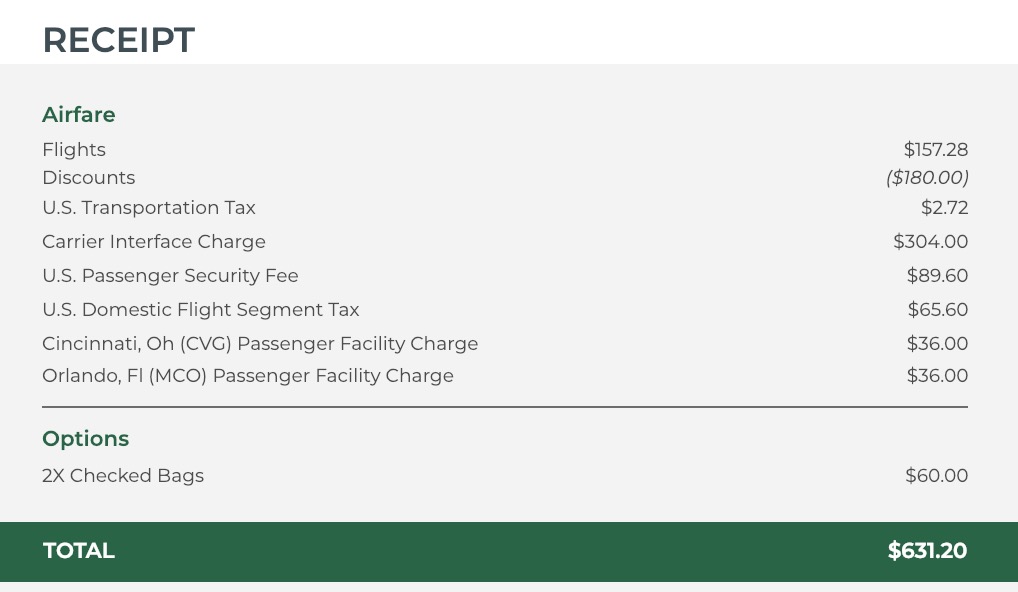 We flew our family of 8 to Orlando last week on Frontier. Our total came to $631.20 (not including a $500 voucher that we had previously gotten from Frontier). This broke down as follows