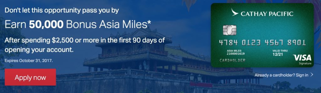 We’ve covered their credit card before, but it has a temporarily increased signup bonus (50,000 Asia Miles), good through October 31st. You can get to the card’s landing page here. I do not receive a commission if you’re approved for this card as far as I know.