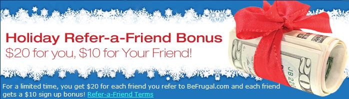 BeFrugal.com Refer-a-Friend program allows for members to receive a monetary reward for participating in the bonus program. During the period of October 16, 2014 – December 31, 2014, BeFrugal members will earn a $20 bonus for each qualified new member they refer through the BeFrugal.com Refer-a-Friend program. In turn, each qualified new member referred through the Refer-a-Friend program will earn a $10 Sign-Up bonus. Current BeFrugal.com members are not eligible as new referrals and cannot earn a Sign-Up bonus. To qualify for a bonus, new referrals must click on your unique Refer-a-Friend link and sign up as a BeFrugal.com member through that click through. . New members must also confirm their BeFrugal.com account and earn $25 or more in Cash Back (not including bonuses and earnings from non-purchase activity) within 90 days of account creation. Accounts will be terminated and bonuses forfeited for improper abuse of the Refer-a-Friend program, including, but not limited to: using search engine sponsored listings or any other paid advertising; creating multiple accounts for one individual; posting your referral link on merchant site, merchant’s social media page or other similar activity; impersonating BeFrugal.com; spamming web forums and other online properties. Determination of bonus eligibility will be at the sole discretion of BeFrugal.com.