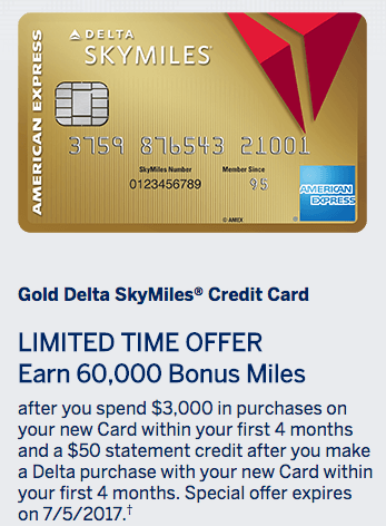 The first card is the Amex Gold Delta SkyMiles® Card which is offering a signup bonus of 60,000 SkyMiles after spending $3,000 within the first four months of opening the card.