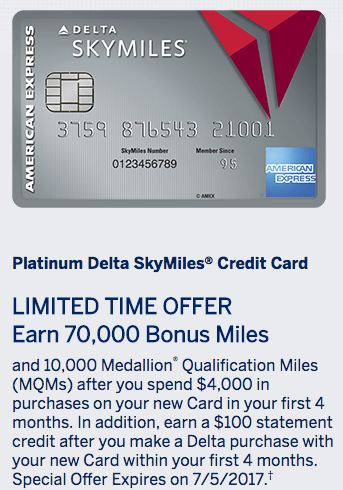 The other card with an increased signup bonus is the Amex Platinum Delta SkyMiles® Card. That one has a signup bonus of 70,000 SkyMiles and 10,000 MEDALLION® QUALIFICATION MILES (MQMs) after spending $4,000 within the first four months of opening the card.