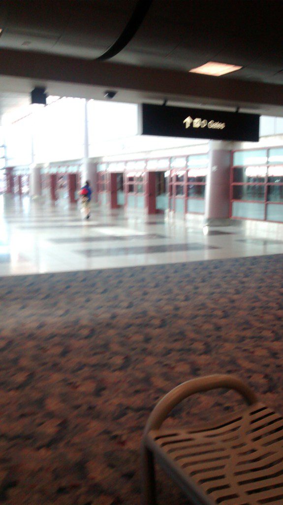 Then we took a tram back that advertised itself as for Terminal 1, Baggage Claim, and A, D and E gates. It seemed like what we wanted but I was really not sure. Tram doesn’t take very long (green dotted line), so we stepped out and were greeted by ANOTHER Do Not Enter TSA sign. At that point we really did not know where to go, but luckily saw off to the right a sign advertising ANOTHER tram, this one to the D Concourse (sorry for the blurry picture)