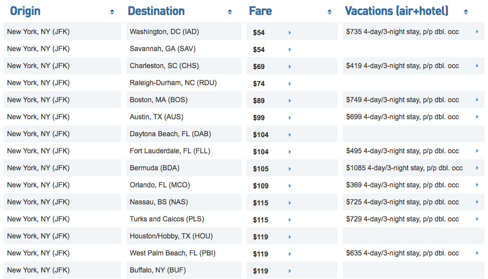 Remember, these are one way flights, so in effect, a roundtrip would be double (or more!). There are some warm weather destinations in there, like the Bahamas and Turks and Caicos, which could make your winter blues disappear for a week or so!