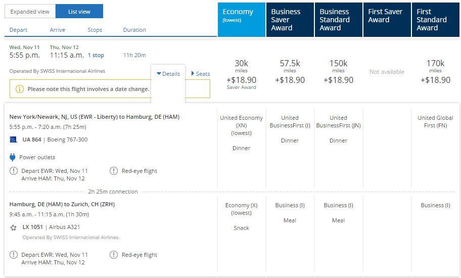 We fly overwater from Newark to Hamburg on United, and then connect from Hamburg to Zurich on partner Swiss Airlines. But because Hamburg and Zurich are both in United’s “Europe” zone, we can still fly HAM-ZRH in Business Class and be charged the United price of only 57,500 miles (instead of the partner price of 70,000 miles)