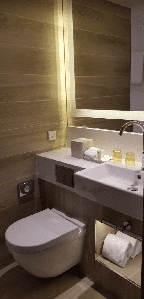 I’m not a huge fan of bathrooms that have only a glass wall separating it from the rest of the room – something I last experienced at the Radisson Blu Rome