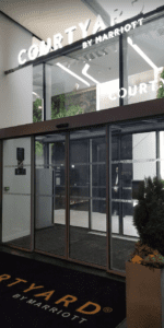 a glass door of a building