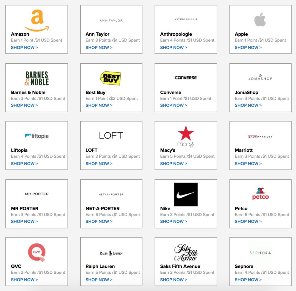 There are currently 29 retailers available in the US, including Amazon (1 Amazon point per $1 spent), Best Buy, Macy’s and more