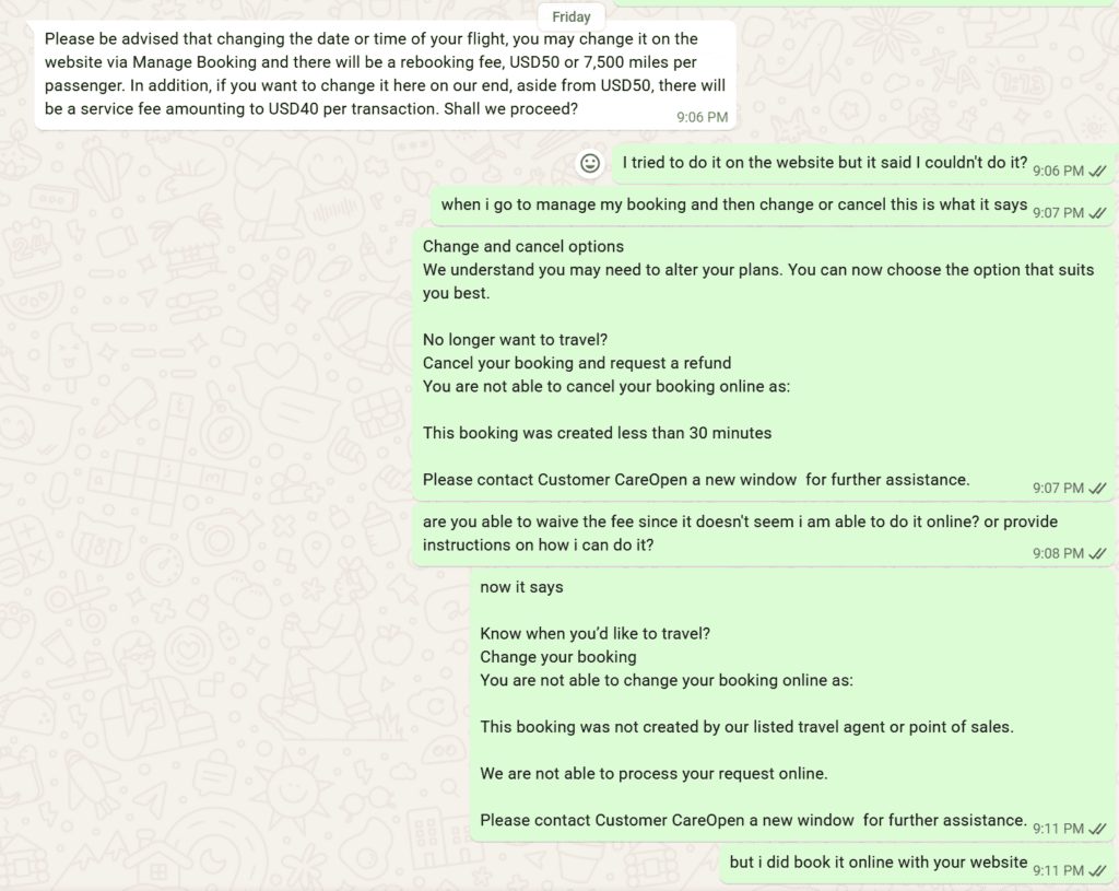 Because the free cancellation was not working for me, I reached out to them via WhatsApp. First they tried to tell me changing the date would be USD50 or 7,500 miles per passenger, plus another USD40 fee for doing it with an agent