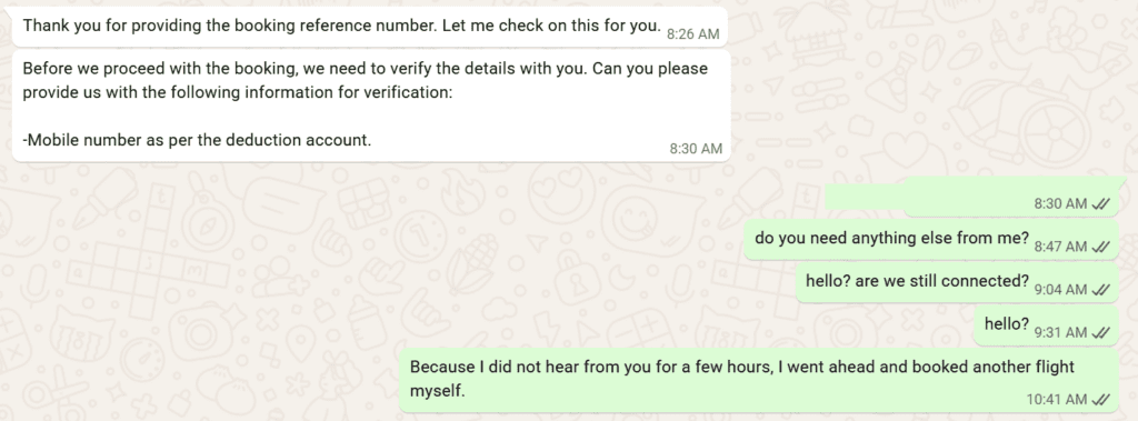 This was (late) on a Friday night. The next morning, I checked my account and the miles were back in my account. I reached back out via WhatsApp and started the process to confirm my ticket. It was going well until the agent somehow disappeared off of WhatsApp