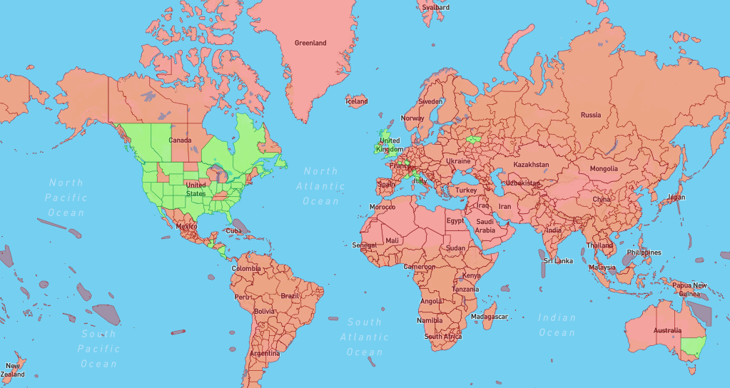 Dan and I have both used a site called Most Traveled People to track our travels. Rather than just track the countries you’ve visited, the site divides the world into 874 distinct places. You track your travels against this list. Many of the places are provinces of countries; however, a good number are a unique part or territory of a country that (e.g. St. Pierre and Miquelon) that truly represent a different place. It’s incredibly hard to make a definitive division of the entire world into unique places, but Most Traveled People has done a fairly good job with their list. It balances total granularity ability to track and achieve well.