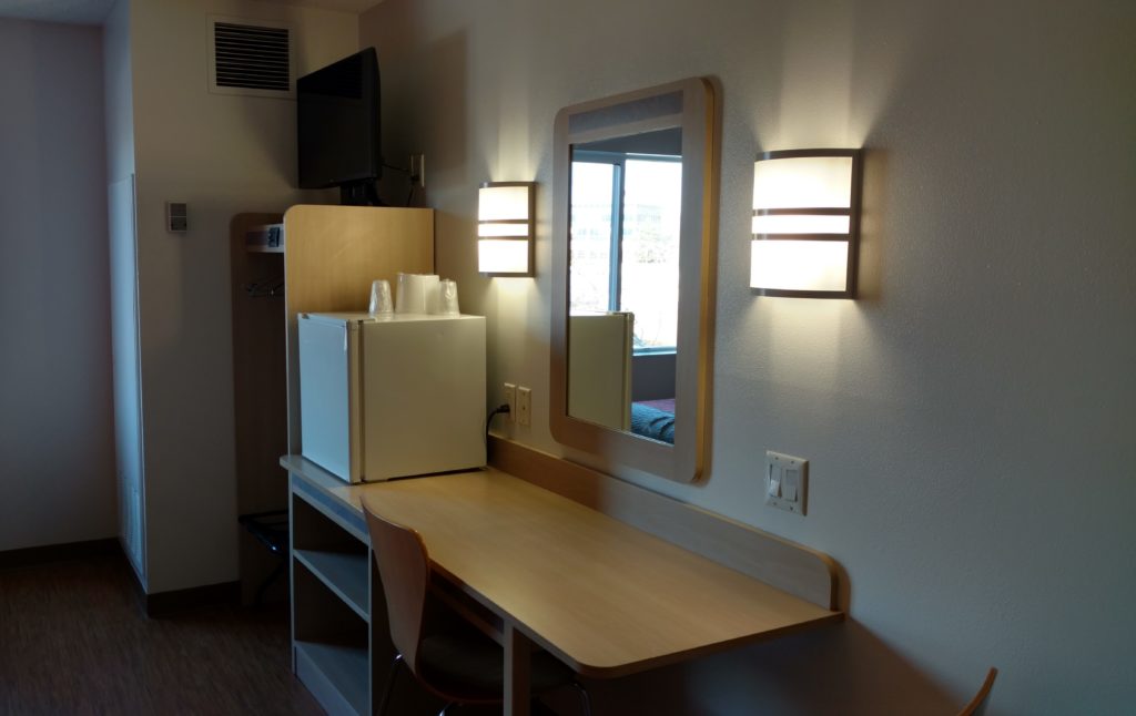 Motel 6 has recently modernized their rooms, so they’re going to be nicer than you remember from family roadtrips as a kid. They’ve adopted a medium orange throughout their design, including accent walls and bedding within the rooms. I don’t mind the orange at all, and I definitely feel the modern look with the bright colors. The flooring is a faux wood panel throughout, including the bathroom. Looks nice, and I’m sure it’s easy to clean. A huge plus both for the hotel and the guests. Ever go into a hotel, and wonder what that mark on the floor is? Won’t happen here.