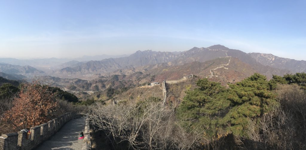 The wall and mountain scenery around us was breathtaking. And there were *so* few people on this side of the wall. Supposedly, the other side is the most scenic and is better to hike, but I was entirely satisfied with our choice. Our Mutianyu Great Wall tour seeing this magnificent wonder of the world ranks high on my list of top travel experiences. Here is a panorama near the highest point on the east side of the Mutianyu Great Wall: