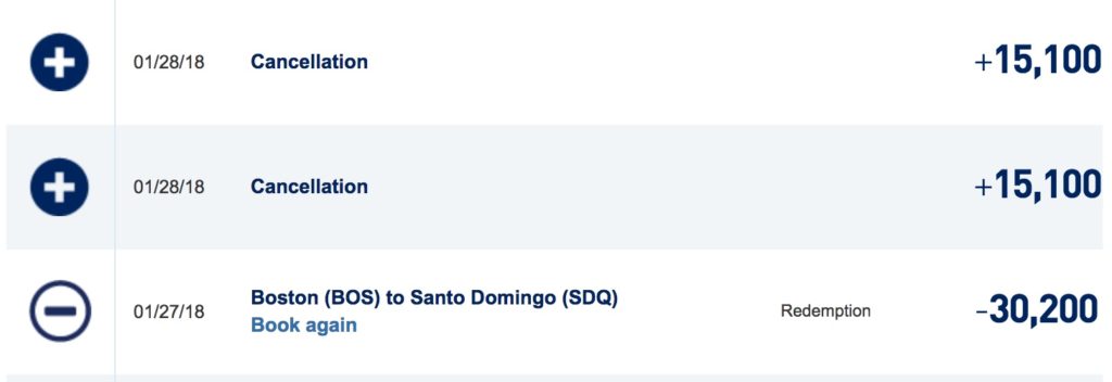 As you can see, JetBlue proactively cancelled the BOS to SDQ flights and redeposited the points into my account. They did this all without any communication with me so I’m not 100% sure how they determined I had not booked the flight. Clearly they have their ways to determine when a JetBlue account was hacked. You can also see that they figured out the problem the day after the flight was booked.