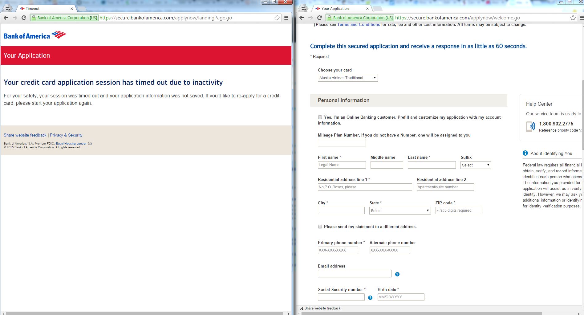 But every time I started typing in one of the windows, Bank of America would time out the other window (as shown above). Â I tried refreshing it, but if I’d type in the left window, it would time out the right window, and vice versa.