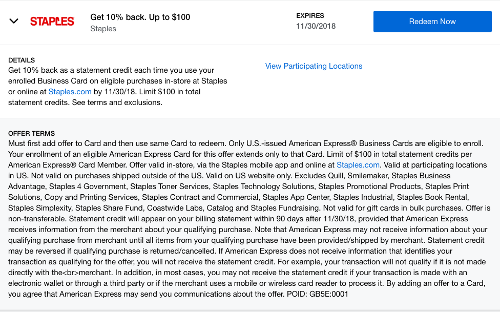 Here’s another another amazing offer from American Express. This time it’s with Staples. Remember these are targeted offers. See below to find out how you can check if your card was targeted.
