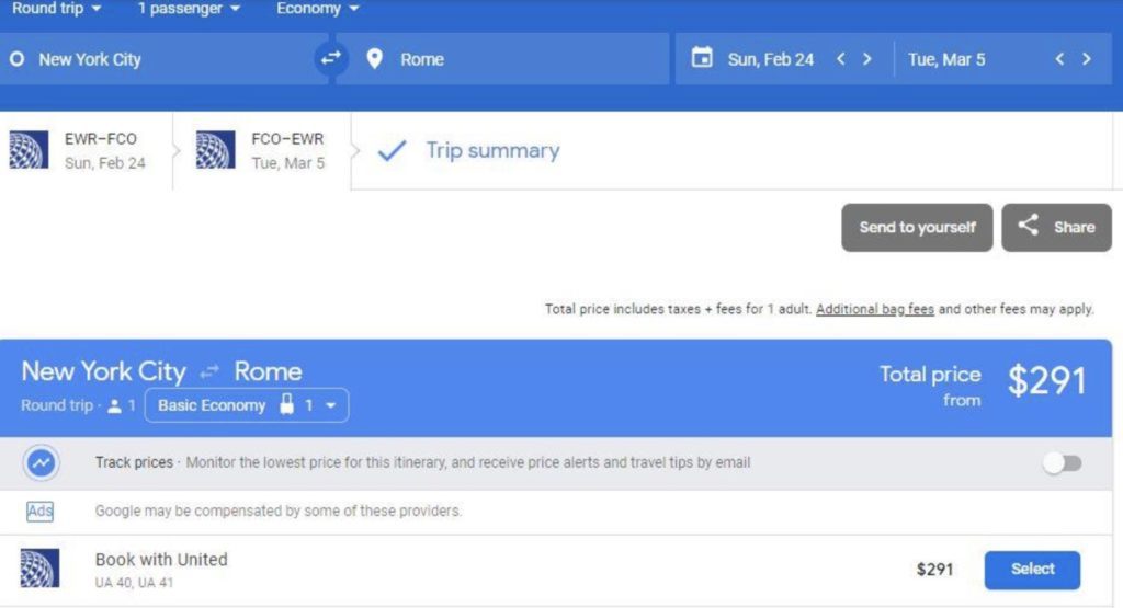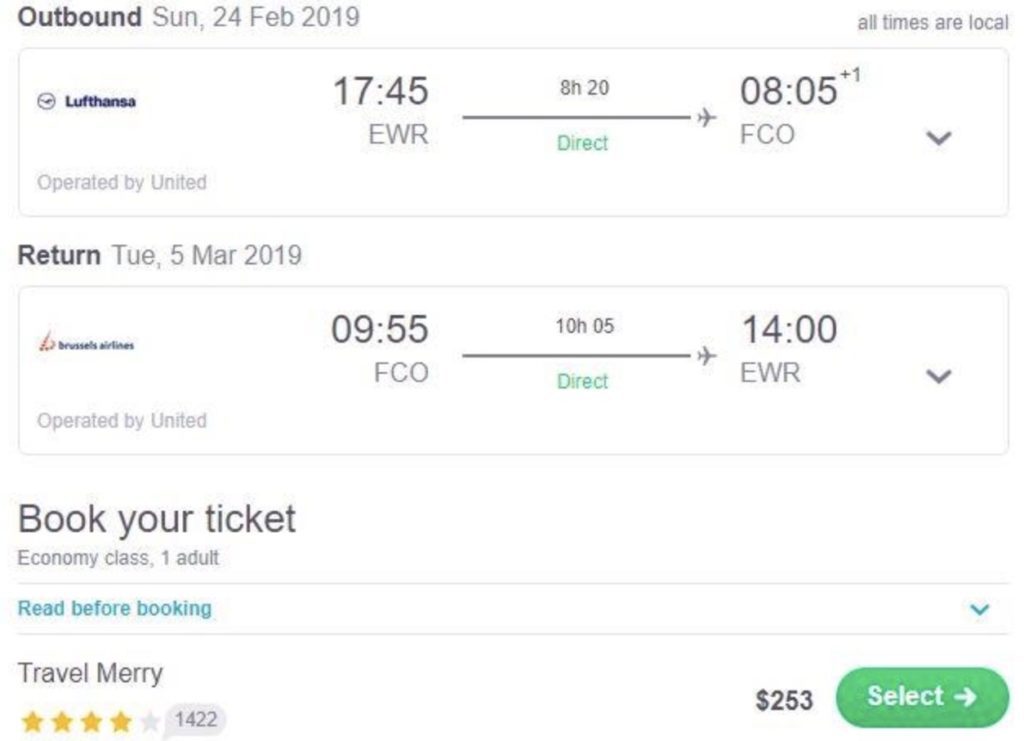 Currently you can fly round trip New York City to Rome Italy for at $253 on United Airlines. Travel dates include Late February 2019 to March 2019. Find availability through Google Flights then search on Skyscanner to drop the price.