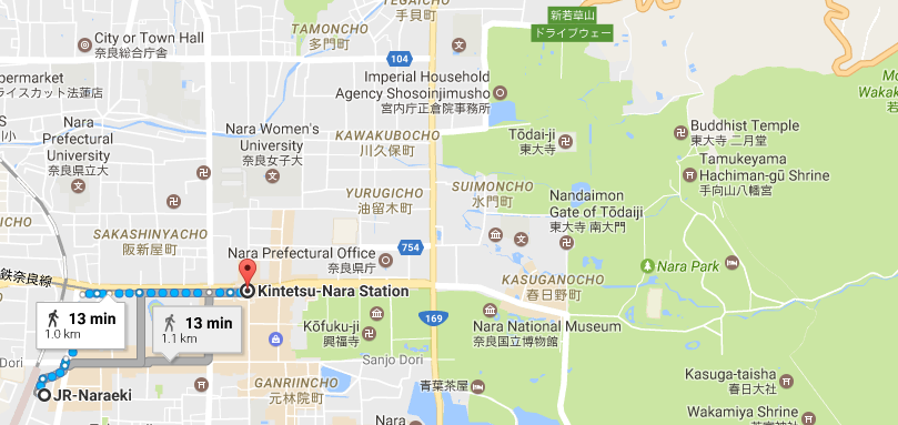 Nara is within easy day-trip distance from nearby Kyoto and Osaka. The best way to reach Nara is to take the Kintetsu Nara Line limited express from either Kyoto Station or Osaka Namba Station. The line will end at Kintetsu Nara station, which is just five-minute walk away from Nara park. Alternatively you can also get here by JR. Nara JR station is about 20 minutes walk to Nara park (green area shown in the map below).