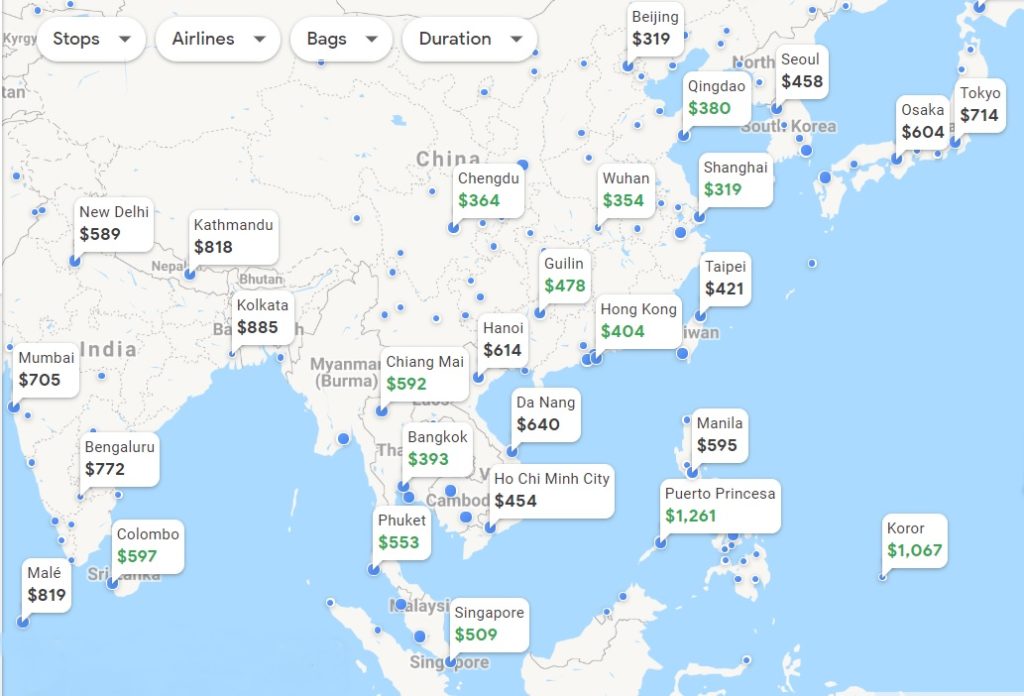 One great thing about the fares you’ll find on Google Flights to Asia: they are all main economy and thus include seat selection and checked bags! No carrier I have found offers basic economy to Asia; every fare includes seat choice, meals (and alcohol if you desire) and usually 2 checked bags. The same can be said for flights to Africa and Australia as well. South American fares generally offer the same, though 1 checked bag is offered on Interjet, and low cost carriers do operate basic economy to South America.