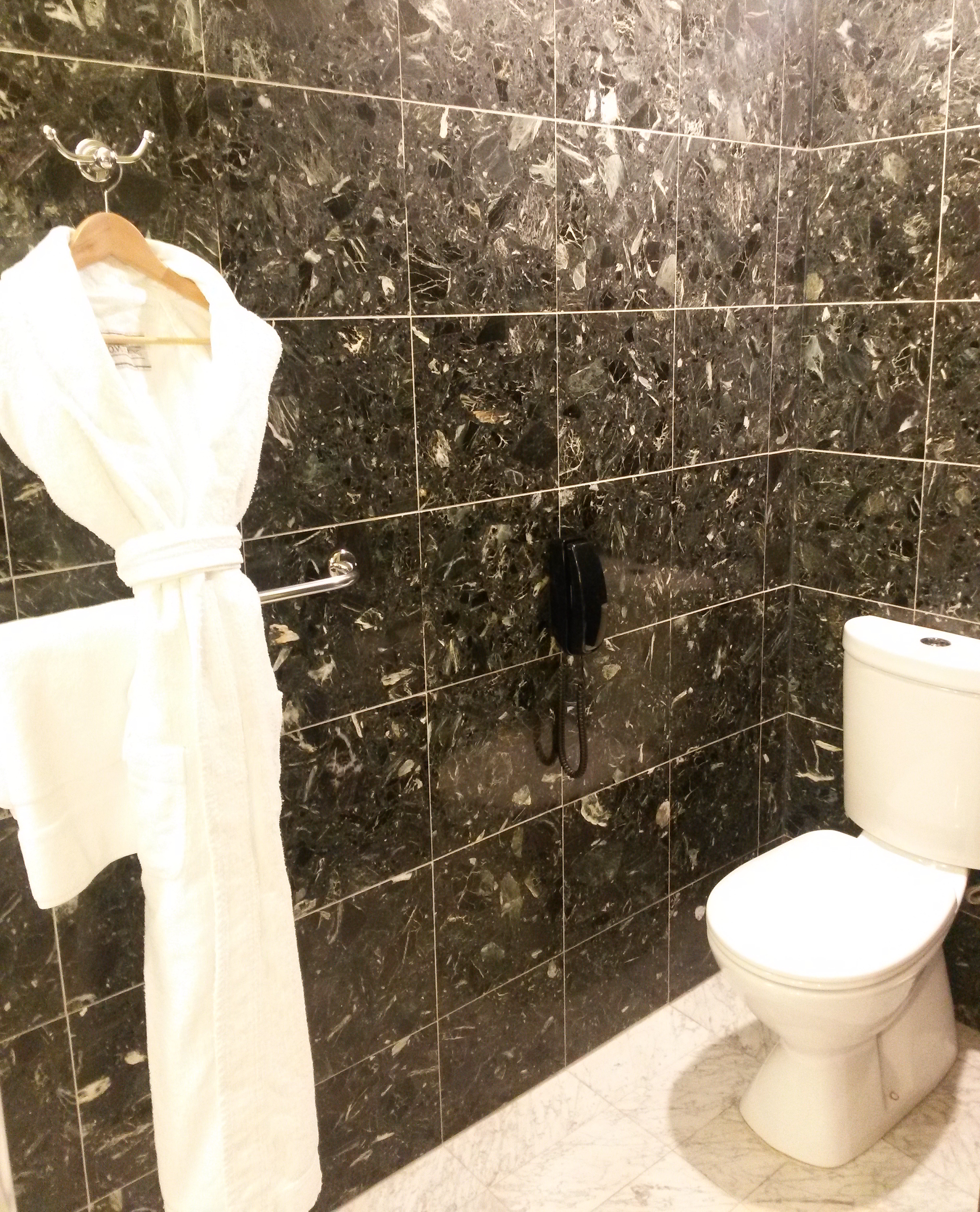 In the corner next to the door was the toilet and a bathrobe.