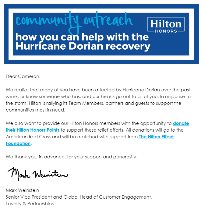 - Donations can be in the form of a credit card charge or a Hilton points transfer.