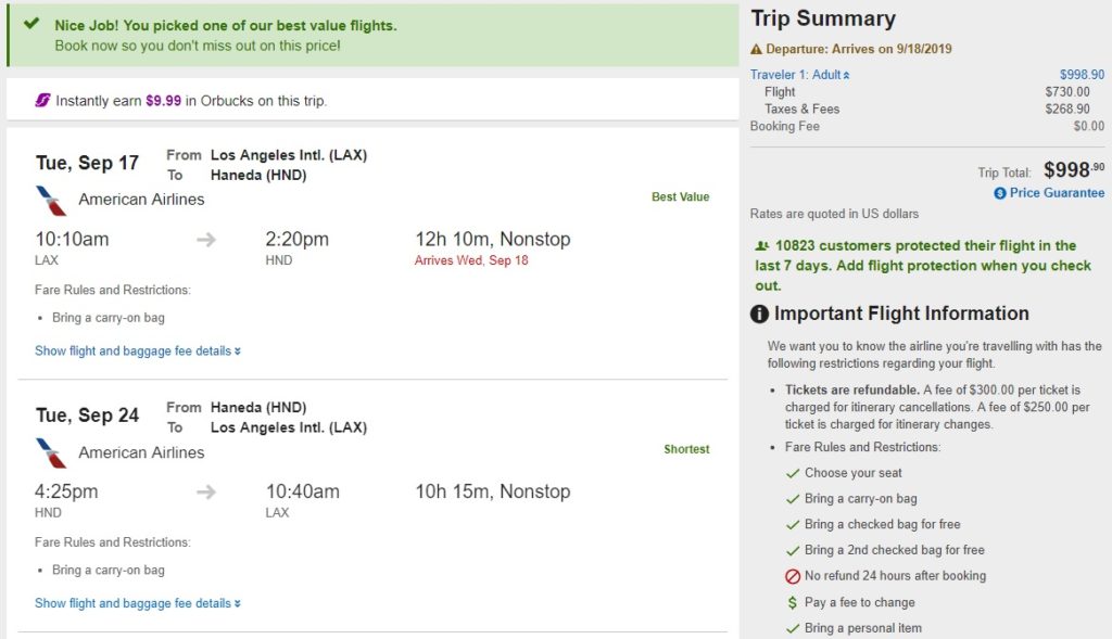 Like almost all economy flights to Asia, both main cabin and premium economy come with 2 checked bags in addition to your carry-on and seat choice. The main cabin fares are widely available through next April, but the premium economy round trip is much more limited. However, the one-way return in PE can be found on many dates with expensive round trip fares posted. You can book the round trip directly through AA or with OTAs, but the one-way PE deal is only available through American’s website. So if you’re looking for a comfortable ride to Tokyo anytime between now and next spring, take advantage of this fare now.