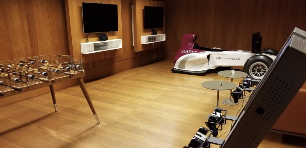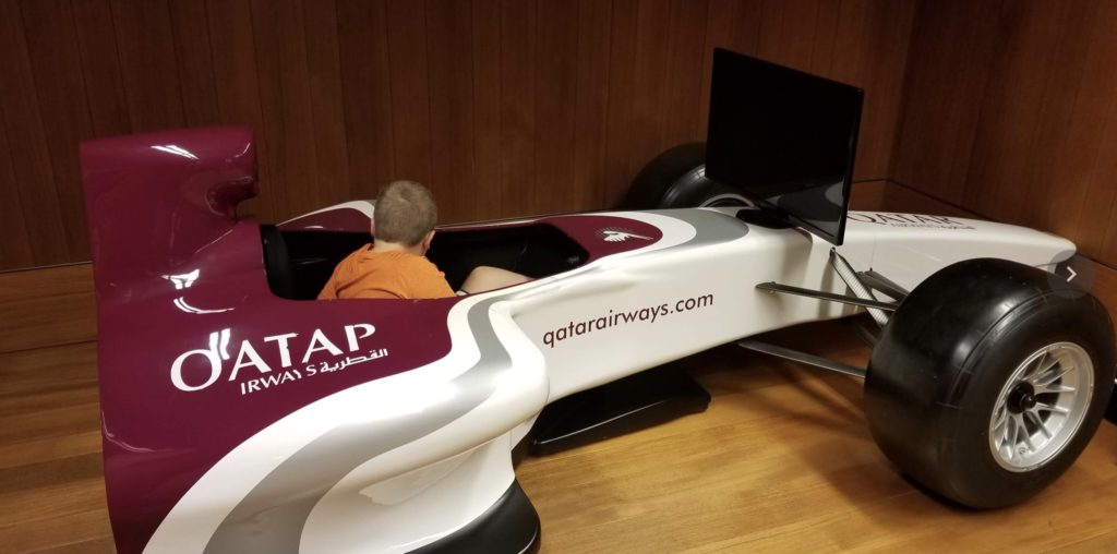 I like the idea of a game room as a concept since an airport can otherwise be a pretty boring place for kids. However this particular game room was pretty underwhelming. Only one of the game consoles even turned on and we could not get that game (a horse racing game!) to work. The foosball table had no ball – we resorted to trying to play with a crumpled up piece of paper but that was about as satisfying as it sounds. My son tried out the Qatar Airways-themed race car, but the screen attached to it did not turn on and we could find nothing to do in it other than just sit in it.