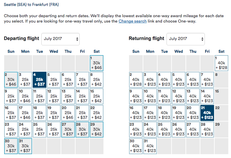 I did a quick search for a family of four from Seattle to Frankfurt this summer. As you can see, award availability is actually quite good. Outbound flight is priced at low level of 25,000 miles, while return flight is being priced at high lever of 40,000 miles.